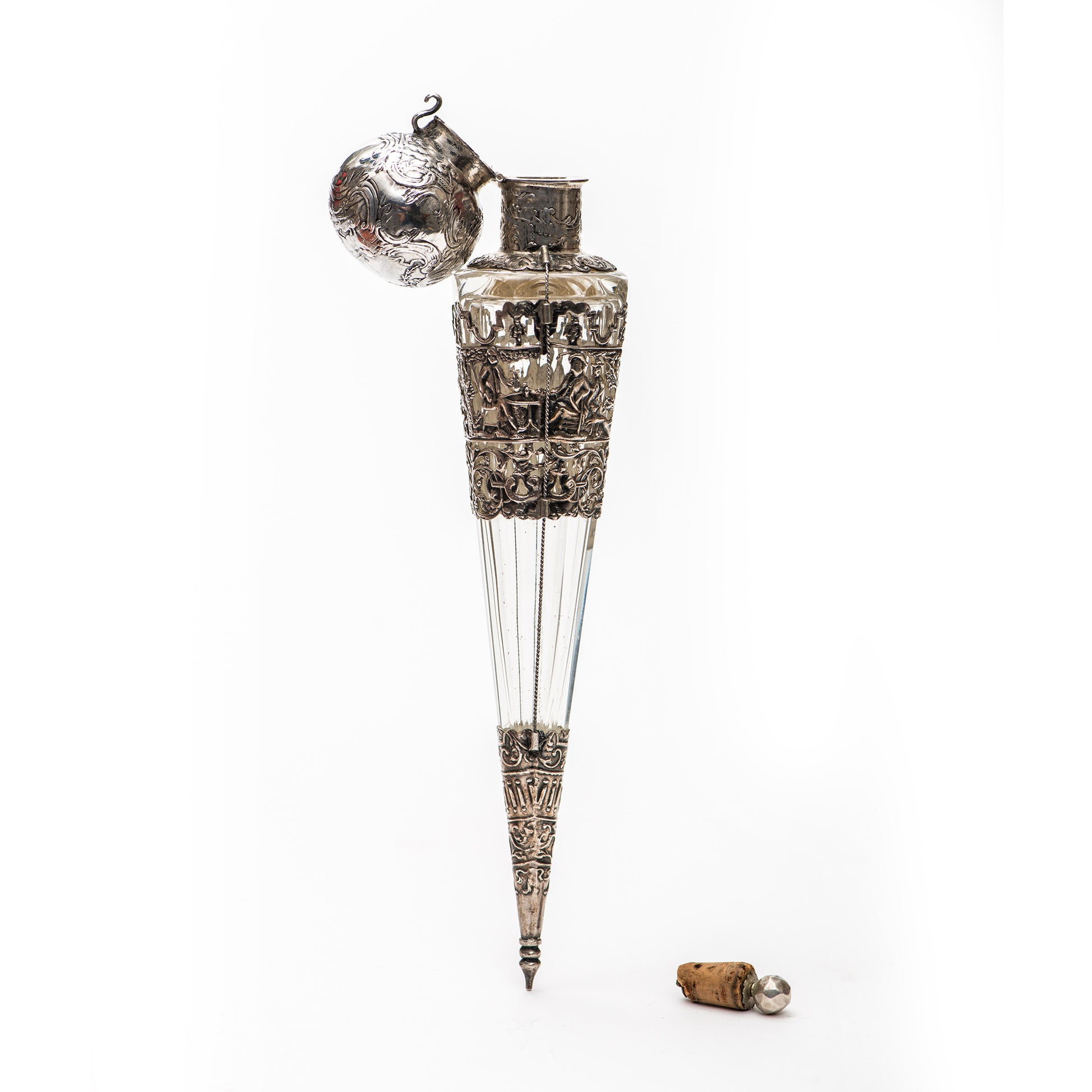 Measuring 10 inches (25.5 cm) long and 2 inches (5 cm) wide at the “neck” of the bottle, the crystal is covered by repousse metal forming convivial outdoor scenes.