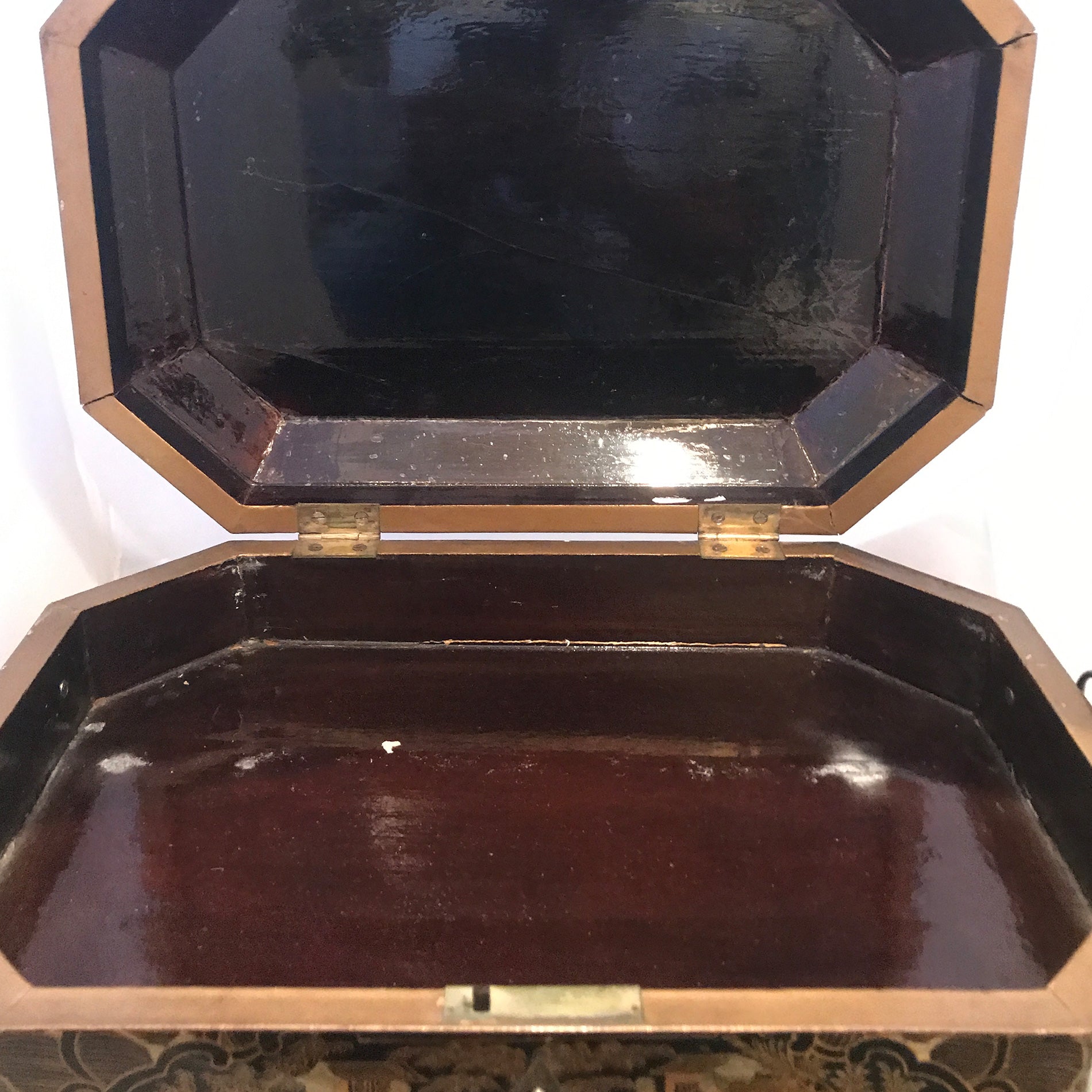 Black wooden Chinese Sewing Box with Golden Decorations.