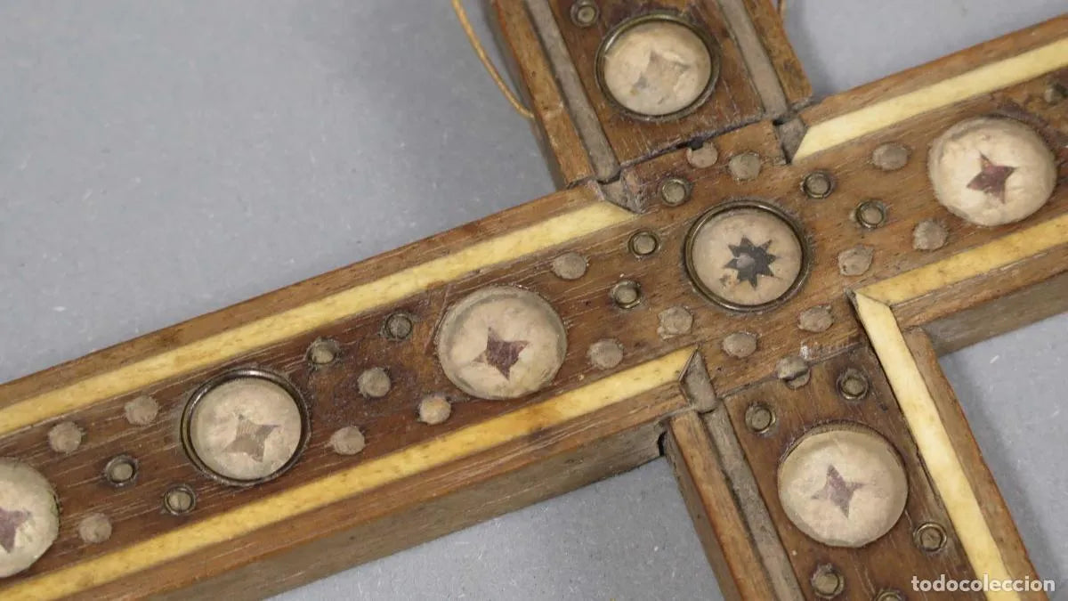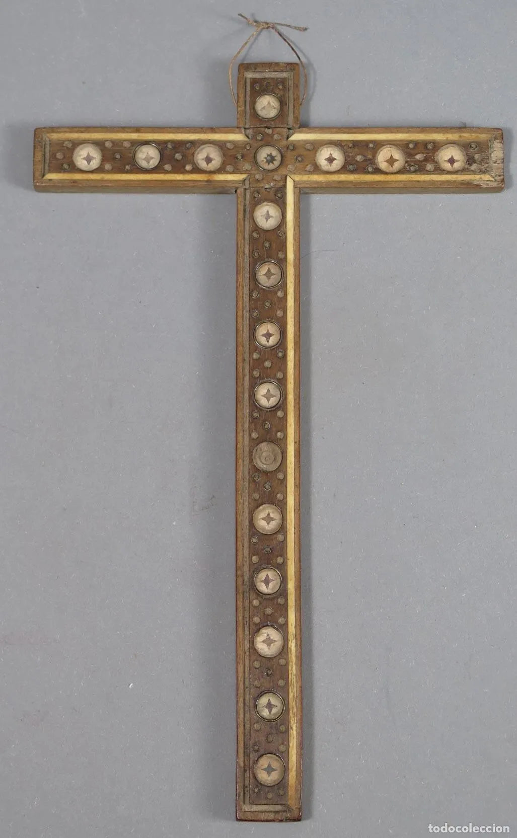 Cruz relicario realizada en madera de nogal con incrustaciones circulares de hueso tallado, disposición típica de trabajos devocionales hispanos del siglo XVII. Ornamentación geométrica y punteada en ambas ramas, conservando su pátina original.