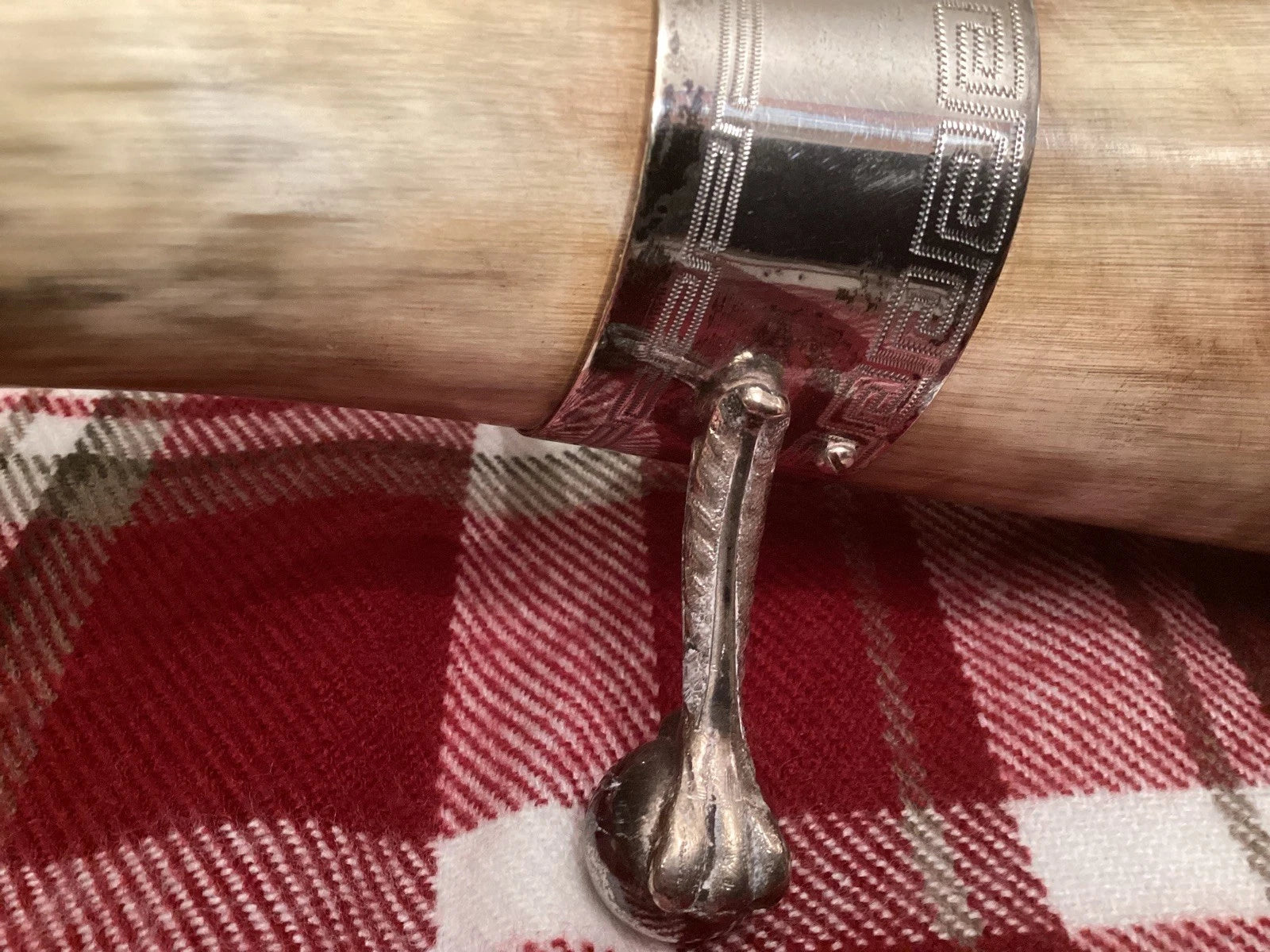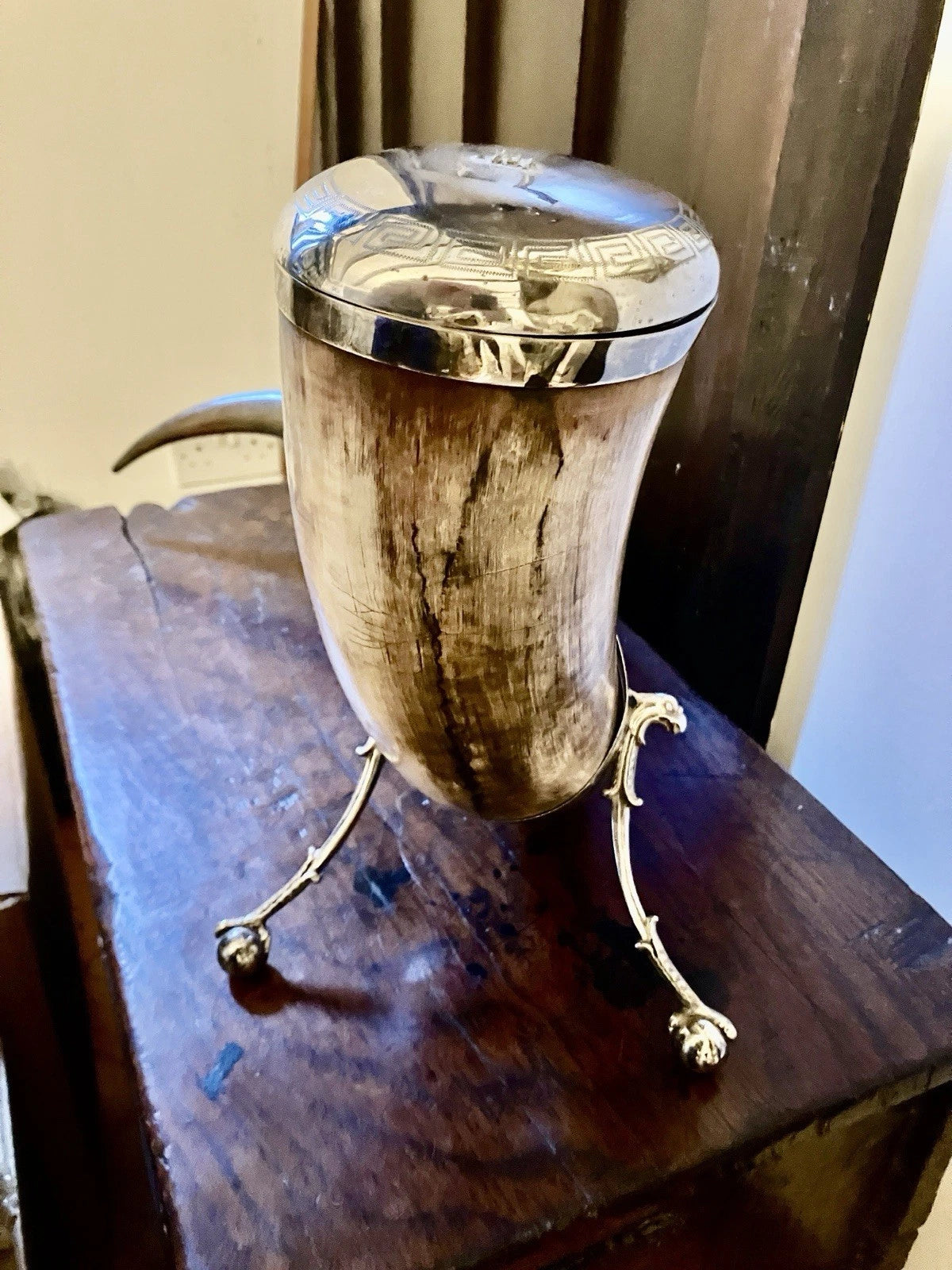 mponente cuerno decorativo antiguo elaborado en asta natural, montado sobre una elegante estructura de metal plateado con tres patas y provisto de tapa superior también plateada. La montura presenta grecas geométricas grabadas, aportando carácter clásico y una fuerte presencia estética.