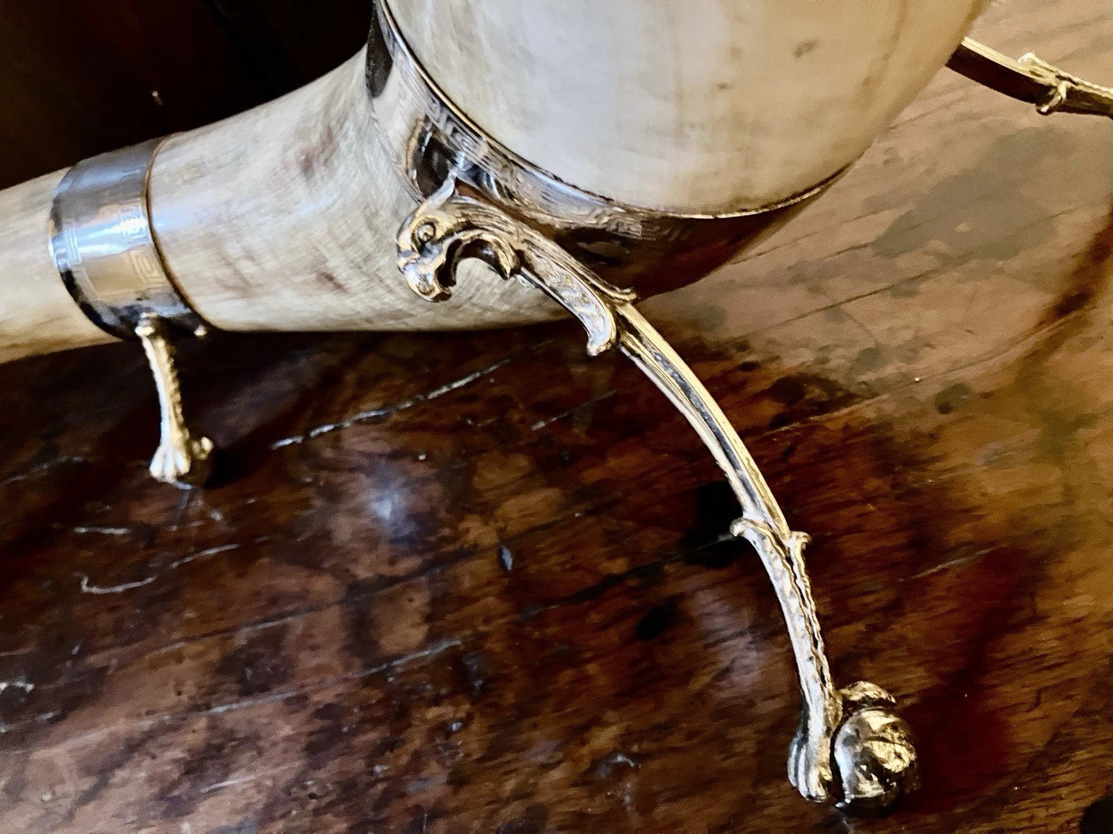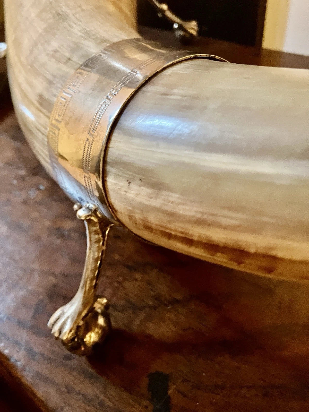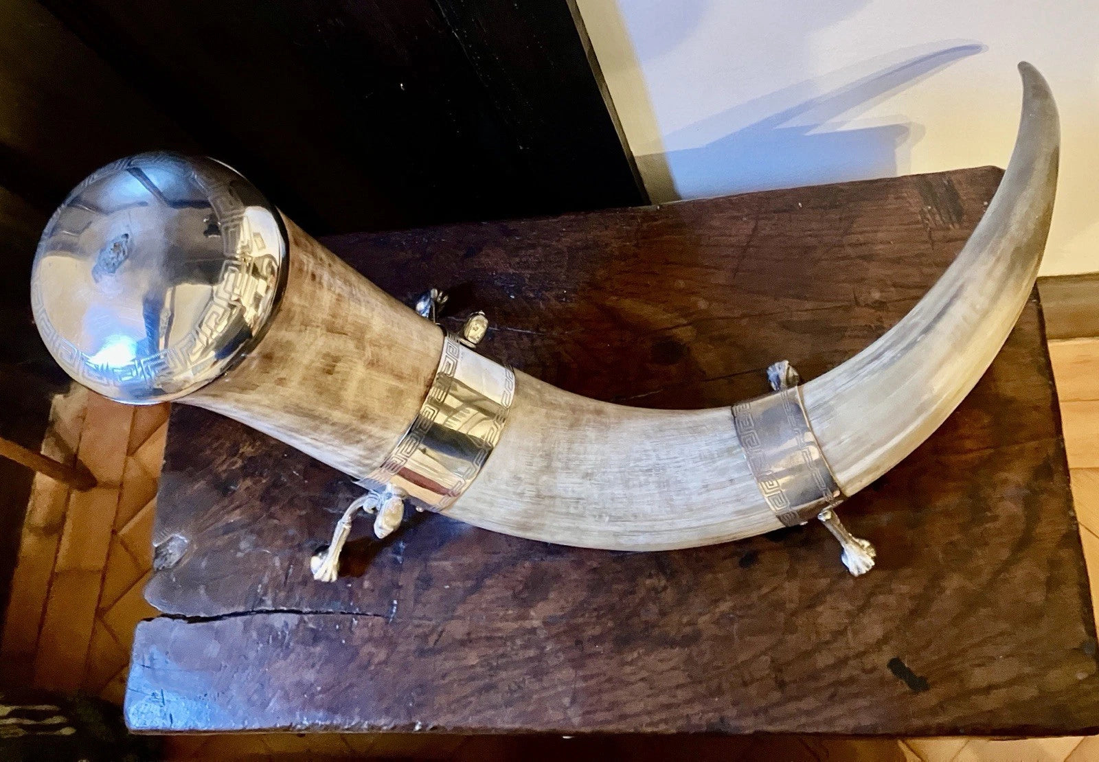 Este tipo de piezas se relaciona históricamente con cuernos ceremoniales, de brindis o de representación, muy utilizados en Europa central y del norte como objetos simbólicos de prestigio. Hoy en día es una pieza escultórica de gran impacto, ideal para vitrinas, bibliotecas, despachos o colecciones de objetos de curio y maravilla.