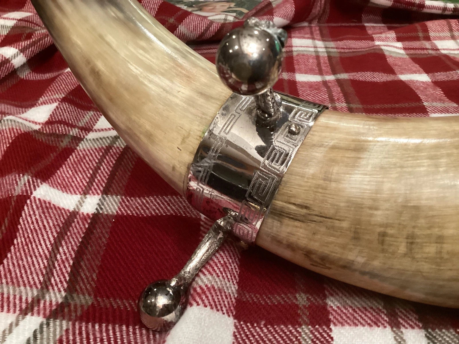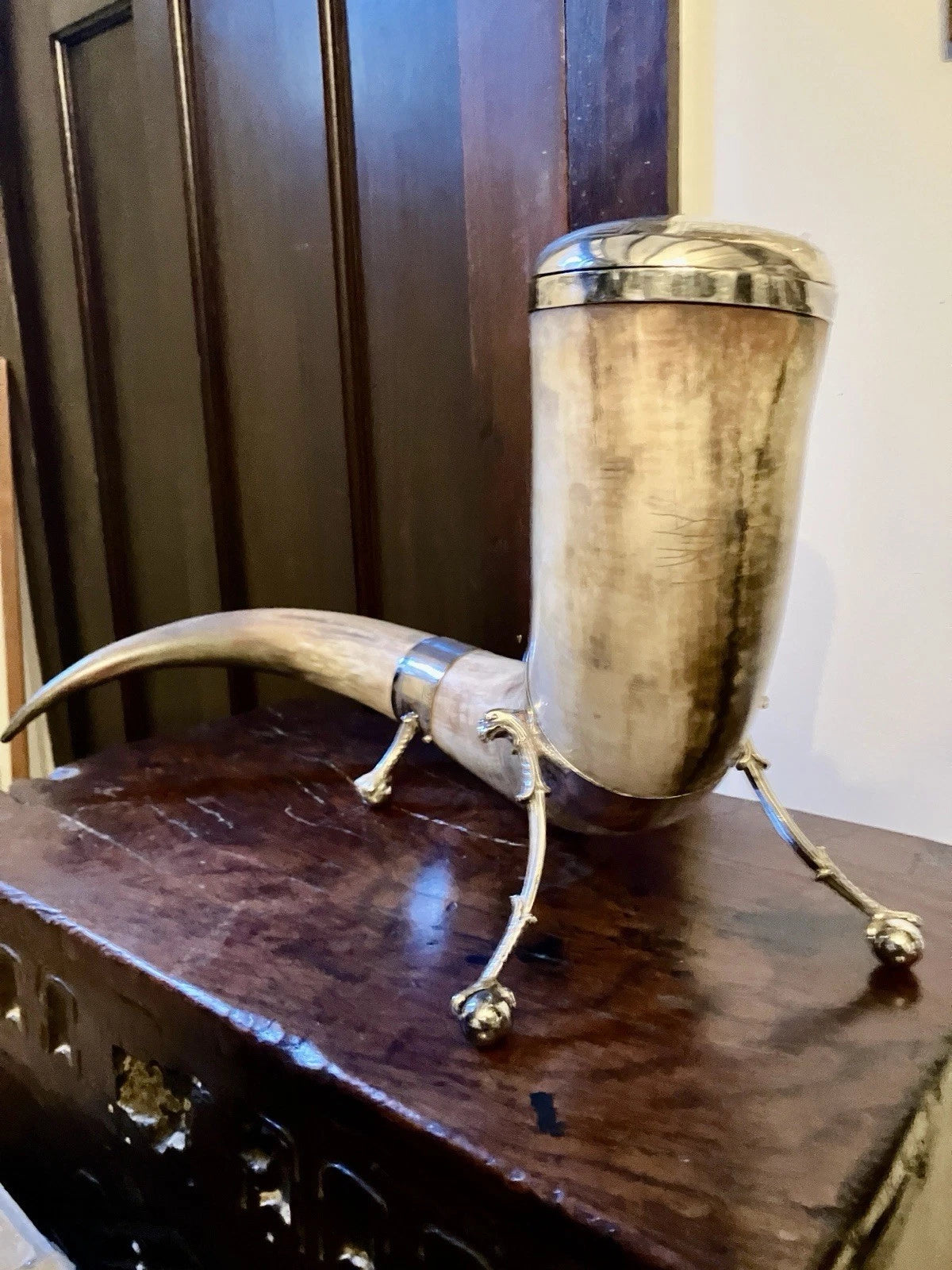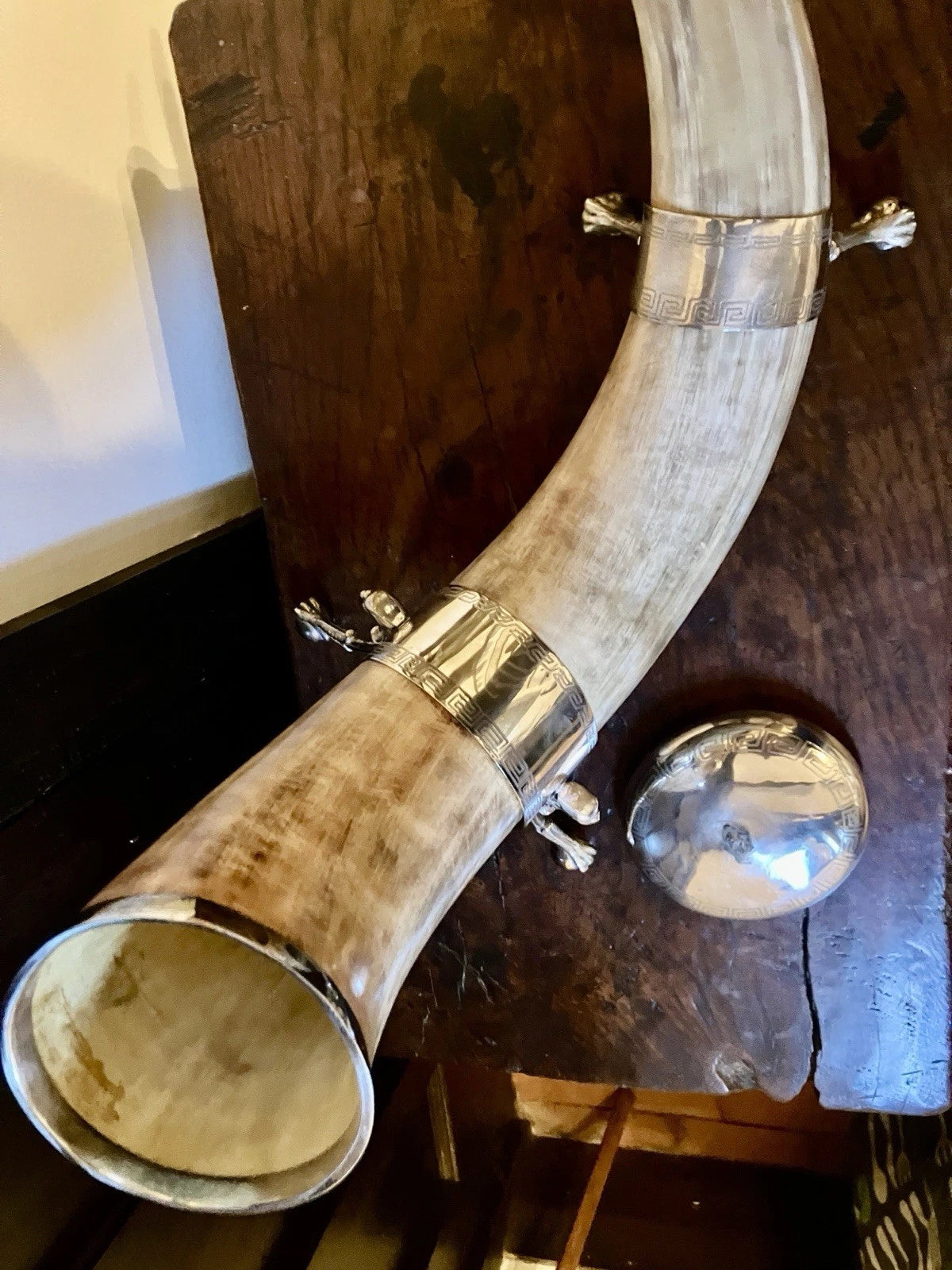 Este tipo de piezas se relaciona históricamente con cuernos ceremoniales, de brindis o de representación, muy utilizados en Europa central y del norte como objetos simbólicos de prestigio. Hoy en día es una pieza escultórica de gran impacto, ideal para vitrinas, bibliotecas, despachos o colecciones de objetos de curio y maravilla.